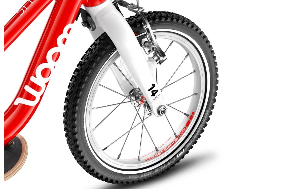 Allt rullar på ett stabilt hjulset med ultralätta aluminiumfälgar som i sin tur är försedda med ett par greppsäkra kvalitetsgummin (14-tummare) som levererar lågt rullmotstånd och pålitlig kurvtagning. När det väl blir dags att sakta ner farten så hanteras detta av ett par pålitliga v-bromsar som inte kräver mer bromskraft än vad små barn kan prestera. Bromsarna är smart färgkodade och inkluderar lätthanterliga reglage med smidig justering av räckvidden, som ser till att de passar även riktigt små händer. Vilket i praktiken ser till att du som förälder kan vara säker på att rätt bromsförmåga alltid finns på plats, oavsett vilka förhållande som råder för dagen. Även handtagen är ergonomiskt utformade och har en diameter som är fullt anpassad för små händer med lite kraftigare styrändar som ger extra skydd och minskar risken för att föraren ska tappa greppet.