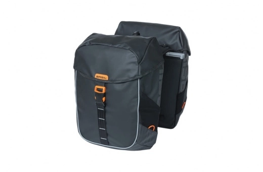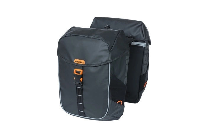 Den sportig Basil Miles Tarpaulin Double Bicycle Bag MIK är består av två sportig cykelväskor i svart med kontrasterande orange detaljer. Cykelväskan är tillverkad av kraftig Tarpaulin och har en total kapacitet på 34 liter. Den har två elastiska fickor på sidorna av väskan, perfekt för att transportera en vattenflaska eller en kompakt regnjacka. Vilket gör väskorna idealiska för både kort eller långa cykelturer eller för en äventyrlig cykelsemester! Skulle det plötsligt börja regna förblir dina grejer torra, eftersom väskan är vattentät och har tejpade sömmar samt en smidig rullstängning under lock med spännen i plast.