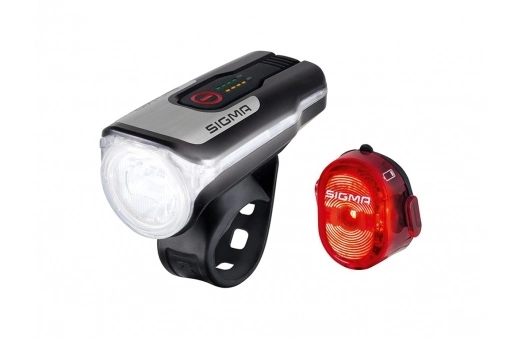 Detta kraftfulla lampset består av uppladdningsbara framlampan Sigma Aura 80 USB och baklampan Sigma Nugget II.