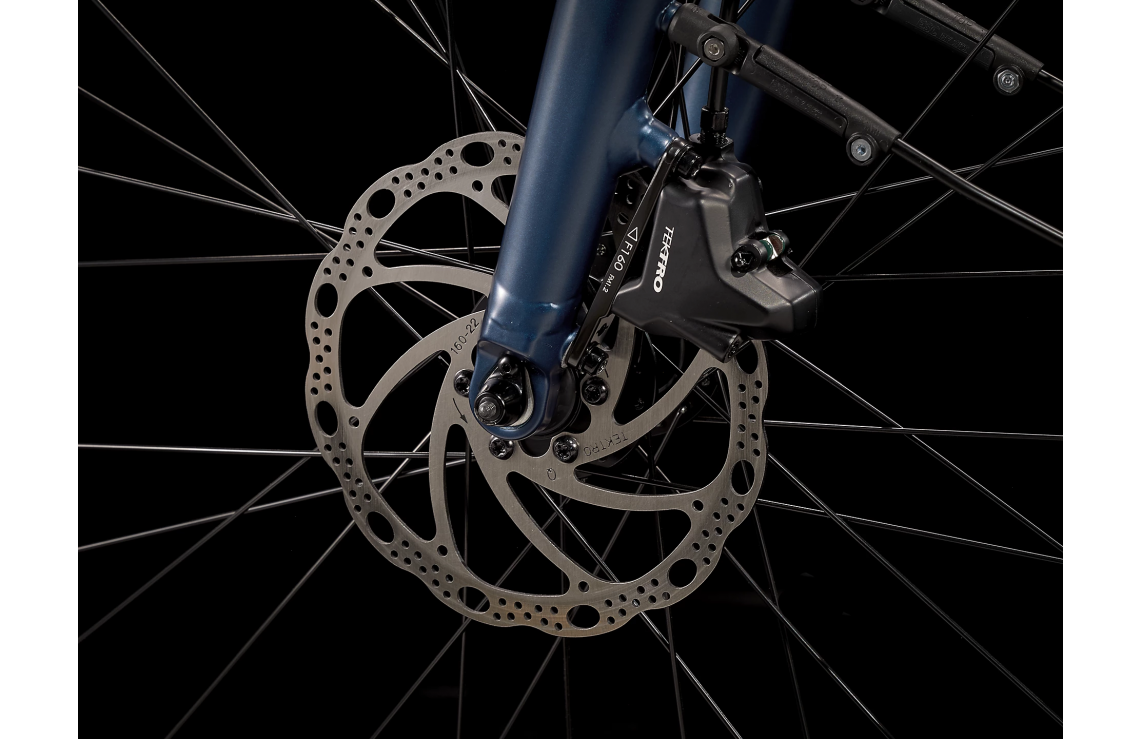 Det robusta hjulsetet består av 28-tumshjul med aluminiumfälgar som försetts med greppsäkra gummin från Bontrager (H2 Comp) som utan problem hanterar allt från slät asfalt och knagglig kullersten till ännu ojämnare underlag. Dessa 40 mm breda däck levererar en fin kombinationen av komfort, stabilitet och lågt rullmotstånd vilket i praktiken innebär ökad trygghet och skönare cykling på de underlag du normalt sett hittar i staden och dess närområden (men cykeln klarar upp till 50 mm breda däck utan skärmar, 45 mm med skärmar). Inbromsningen handläggs av ett par kraftfulla hydrauliska skivbromsar från Promax (DSK-927) som ser till att du har effektiva bromsverkan oavsett om det är lerigt, regnigt eller slaskigt underlag för dagen.