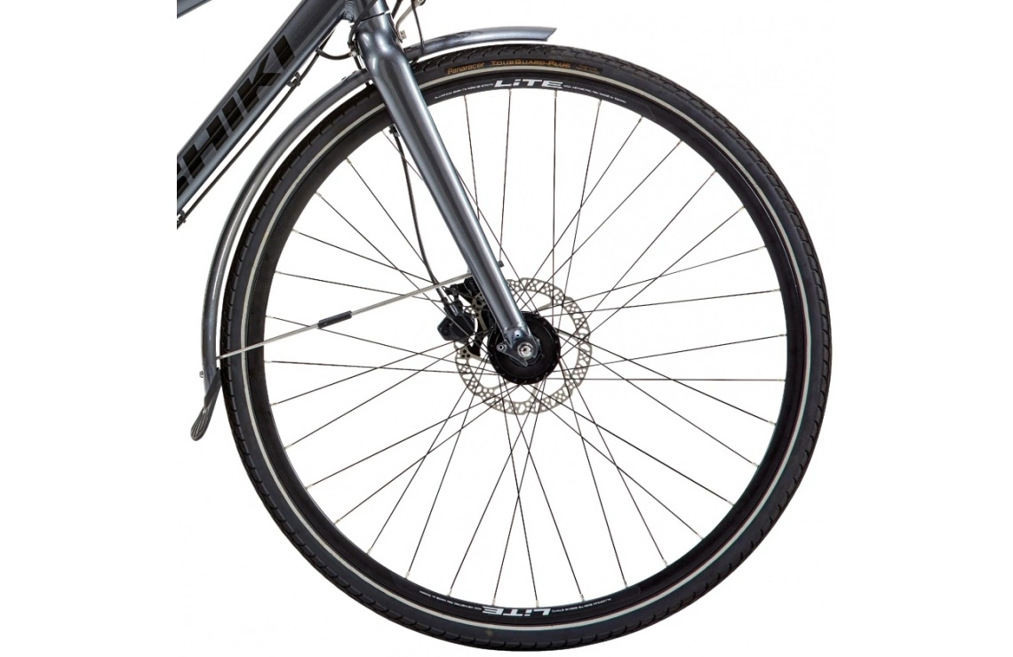 De tåliga hjulen med förstärkta ekrar har Nishiki´s egenutvecklade asymmetriska fälgar som gör hjulen starkare genom att jämna ut ekerspänningen mellan höger och vänster sida. På hjulen sitter ett par kvalitetsgummin från Panaracer (TourGuard Plus) med 35mm bredd och punkteringsskydd, vilket ser till att cykeln faktiskt även klarar lite lättare terrängkörning. En cyklande zenbuddhist skulle nog kalla storleken för den ”gyllene medelvägen”… kör du med lite lägre lufttryck så höjer du komforten och uppnår bättre skydd mot vassa föremål och grus, allt för att du ska få så bekymmersfri cykling som möjligt (främst på lösare underlag). Håller du däcken väl pumpade så står de pall för det mesta och du får en fantastiskt lättrullande cykel (främst på hårdare underlag) som gör dig lika glad varje gång du trampar iväg från klungan.