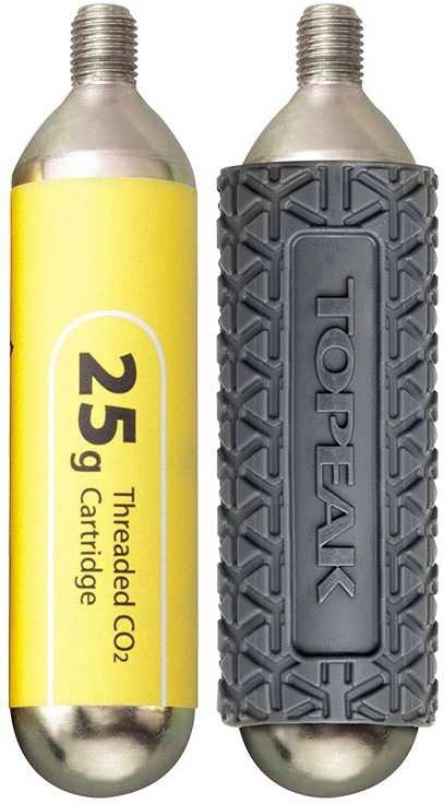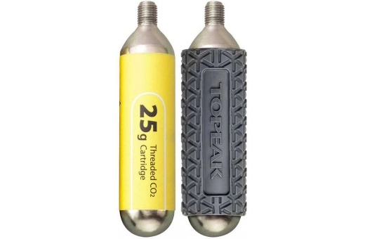 Topeak 25G Threaded CO2 Cartridge innehåller två kolsyrepatroner (2×25 gram) med gängad topp och passar kolsyrepumpar (CO2-pumpar) för gängade patroner samt ett fodral i silikon. Passar till Topeak HybridRocket MT, AirBooster och Micro AirBooster.