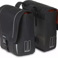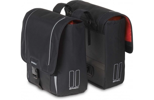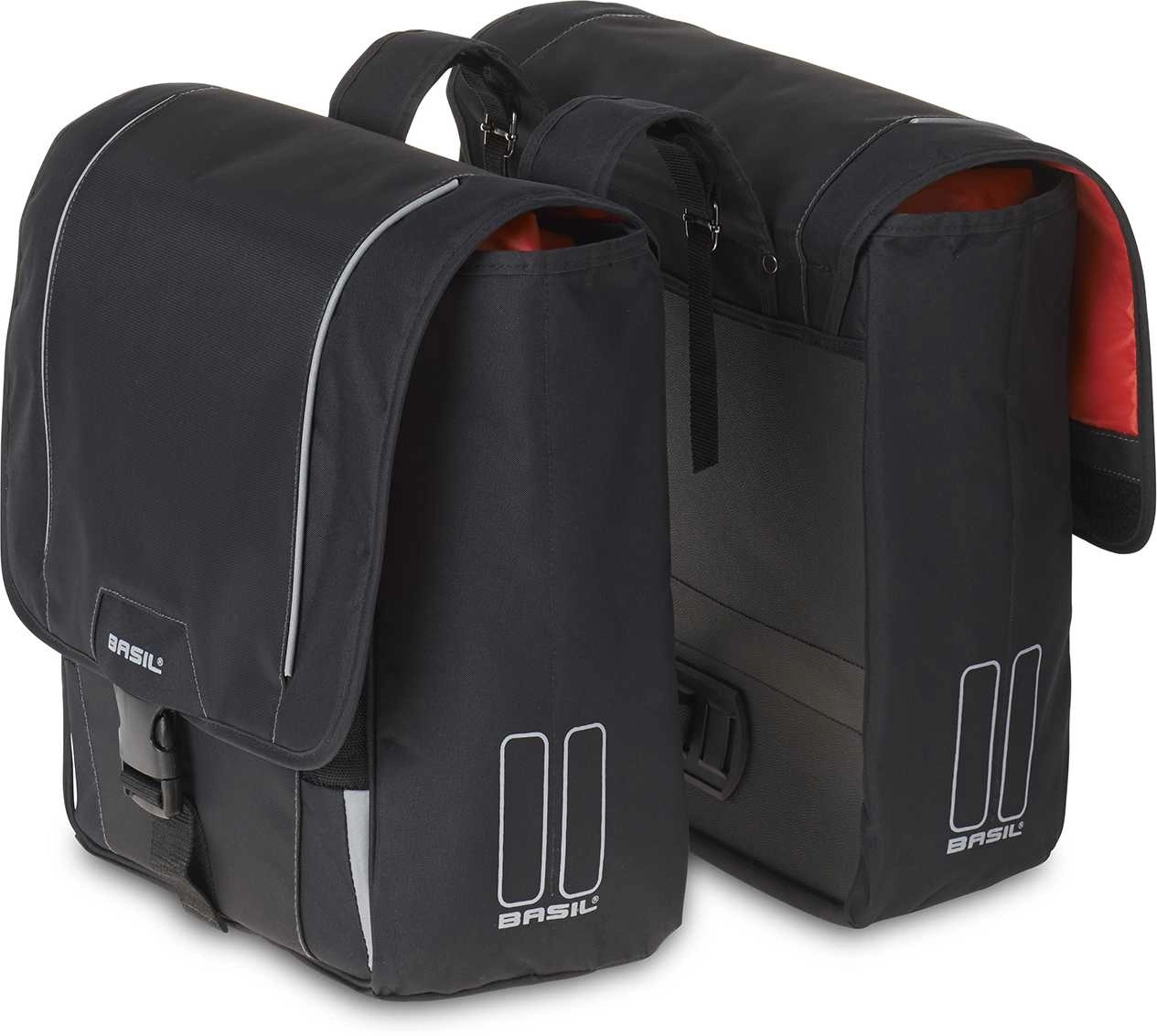 Basil Sport Design dubbel väska för pakethållare i material av hög kvalitet. Elastiska flask-band inuti, huvudfack med dragsko, integrerade reflexer, volym 32 liter, mått 35x15x43 cm.