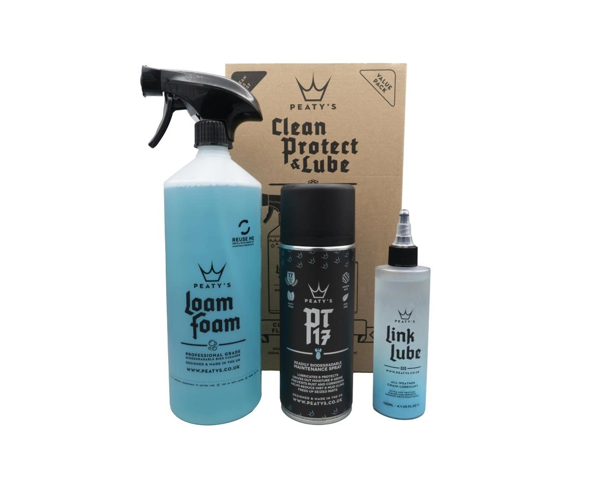 Få den skitne sykkelen klar for ny action med denne startpakken som inneholder 1 liter LoamFoam bike cleaner, 400ml PT17 General Maintenance Spray og 120ml LinkLube All Weather kjedeolje. En enkel måte å komme i gang med å holde sykkelparken i toppform!