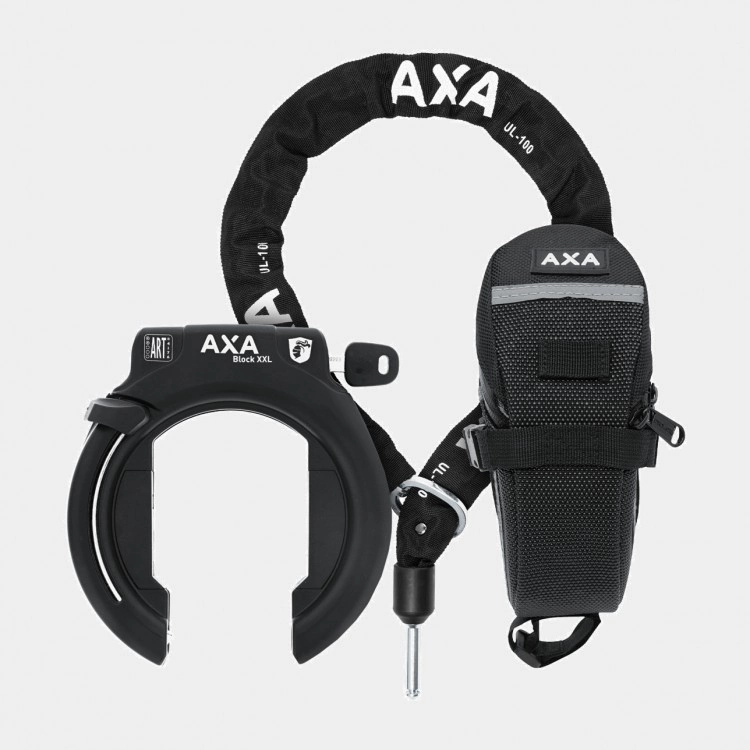 AXA Block XXL + Ramlåskätting är ett kraftfullt ramlås som är godkänt av SSF. Nyckeln kan ej tas ur när låset är olåst. Här får du även en plugin-kätting på 100 cm och med länkar på 5,5 mm att sätta i låset för att låsa fast cykeln i något fast. Låscylindern är skyddad mot borrning och bygeln är tillverkad i härdat stål. Låset är smidigt utformat och enkelt att använda och har extra stor frigång (60 mm) för lite grövre däck. AXA online-nyckelservice gör det enkelt att fixa ny nyckel.