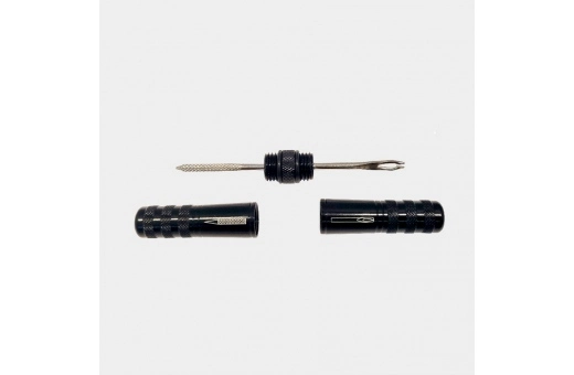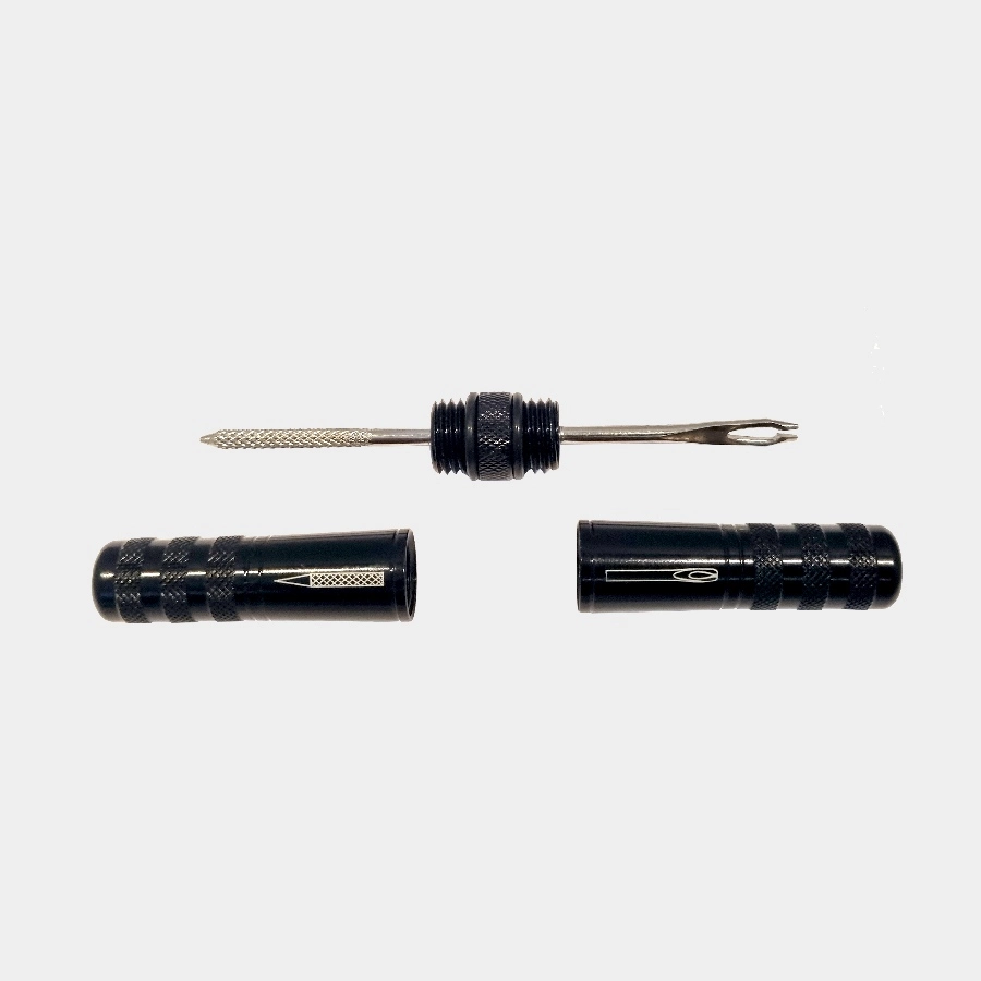 Du får ett smidigt all-in-one kit som innehåller det du behöver. Dels är det ett verktyg för att rugga upp hålet i ena ändan, och dels är det ett verktyg för att för att föra in lagningspluggen (även kallat lagningsmask). Verktygen skruvar du in i vardera ändan med ett fiffigt lock. Ett tips är att klippa av en liten bit på maskarna (de är långa nog!) och då funkar locken även som praktiskt förvaring för lagningspluggarna. Du får 10 pluggar som ingår i satsen. Läs gärna vår artikel om hur du lagar ditt däck med denna reparationssats.