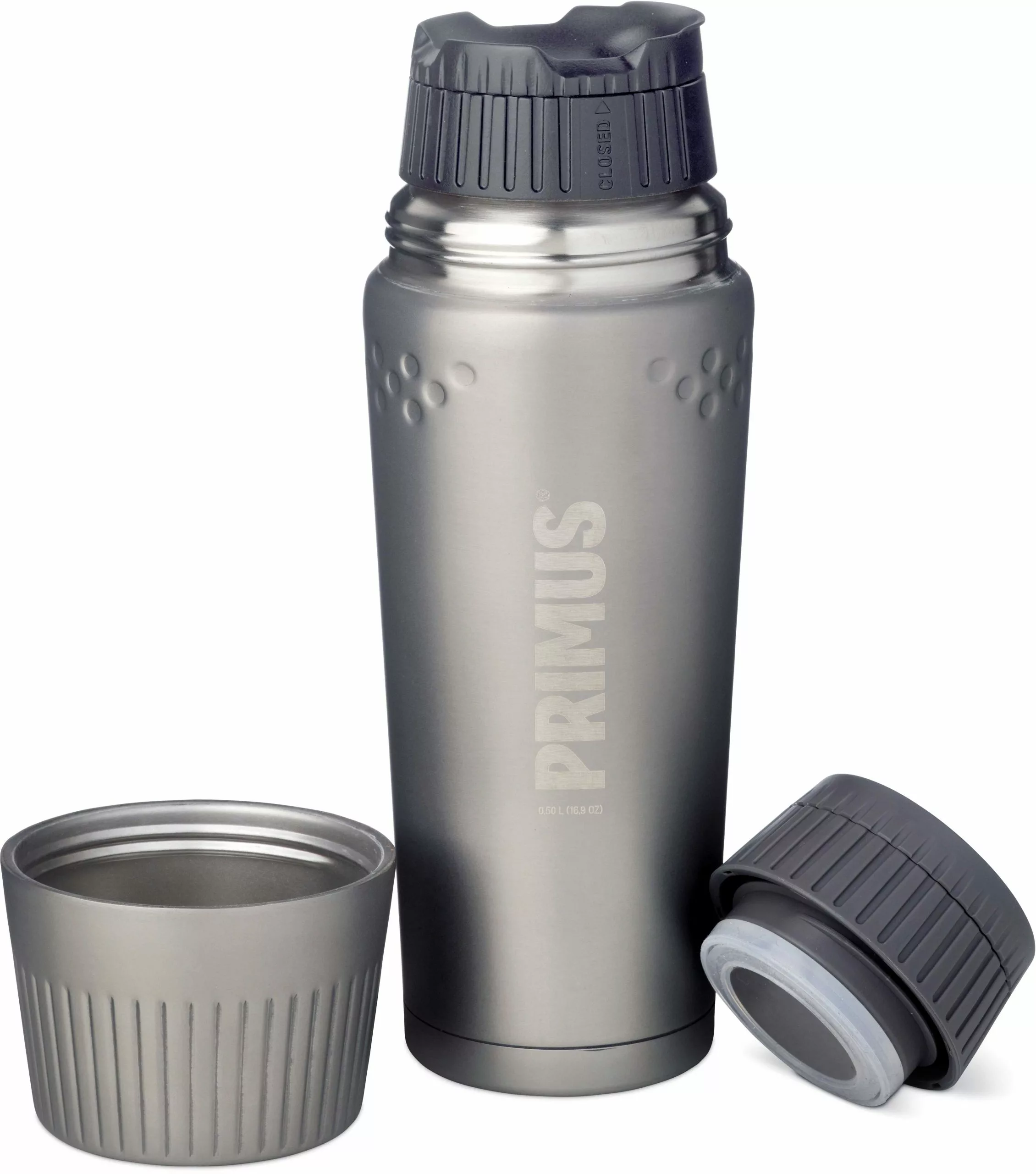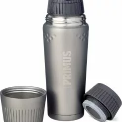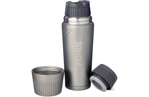 Vakuumtermosen Primus TrailBreak Termos 0.5L har dubbla väggar och är tillverkade i rostfritt stål av högsta kvalitet, vilket gör den både robust och tålig. Den lätt koniska formen gör att flaskan är enklare att packa ner i trånga ryggsäckar, men också enklare att hålla. Både själva flaskan och dess mugg har konstruerats för att erbjuda ett säkert grepp även när handskar eller vantar används under kalla delen av året. Även koppen är tillverkad av rostfritt stål med dubbla väggar, för att hålla drycken varm eller kall samt för att erbjuda korken ett extra skydd. Flaskorna levereras med två korkar, en vanlig och en ClickClose-kork som gör det möjligt att dricka direkt från flaskan utan att ta bort korken.