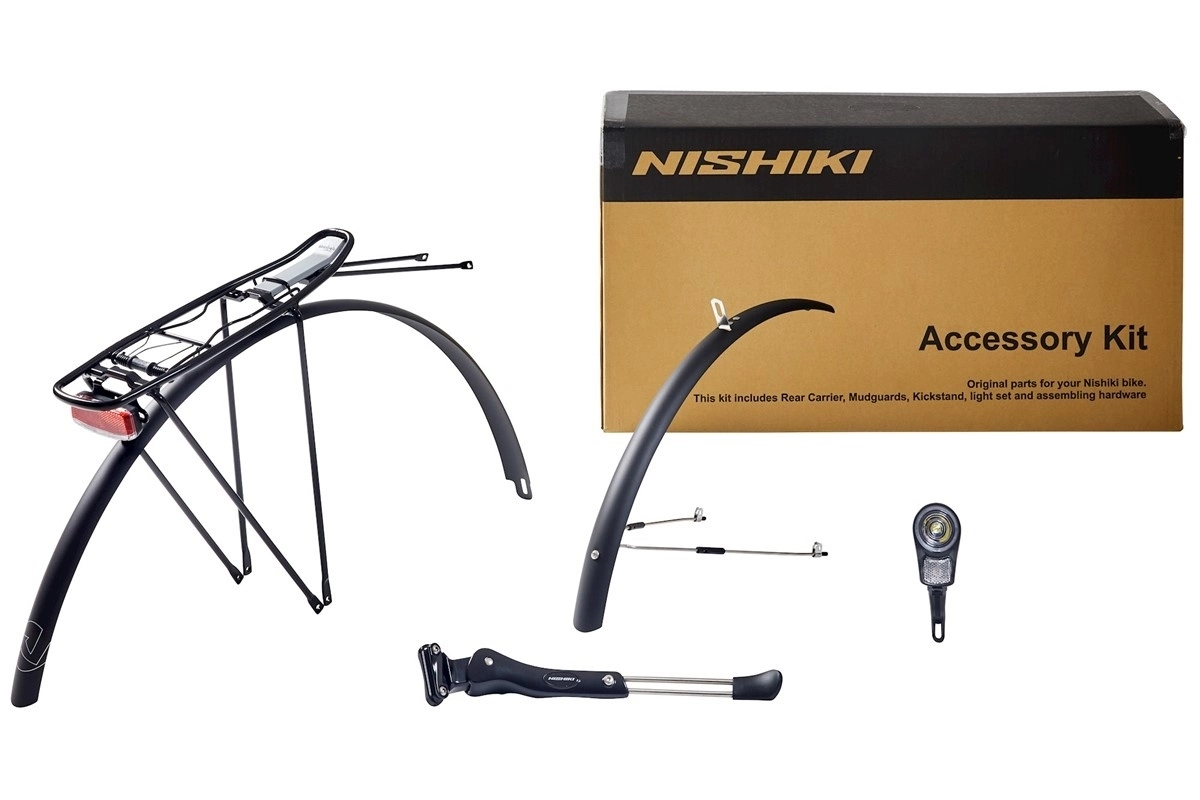 Niskikis tillbehörspaket är framtaget speciellt för Nishiki Race-Hybrid segmentet, alltså hybrider med stel framgaffel. Delarna som ingår är skärmar, pakethållare, stöd och belysning. Skärmarna tillverkas i anodiserad aluminium och är 37 mm breda, med anpassade infästningar och Nishiki-logga. Bakskärmen är integrerad med en slimmad Atran Velo pakethållare i aluminium. Stödet är Nishiki-specifikt och monteras enkelt i ett uttag i ramen. Belysningskitet är med LED-diodlampor, där baklampan är fäst i pakethållaren och framlampan monteras med skärmen. I paketet följer även alla skruvar, monteringsanvisningar på svenska och verktyg. Tillbehörspaketet är enkelt att montera.