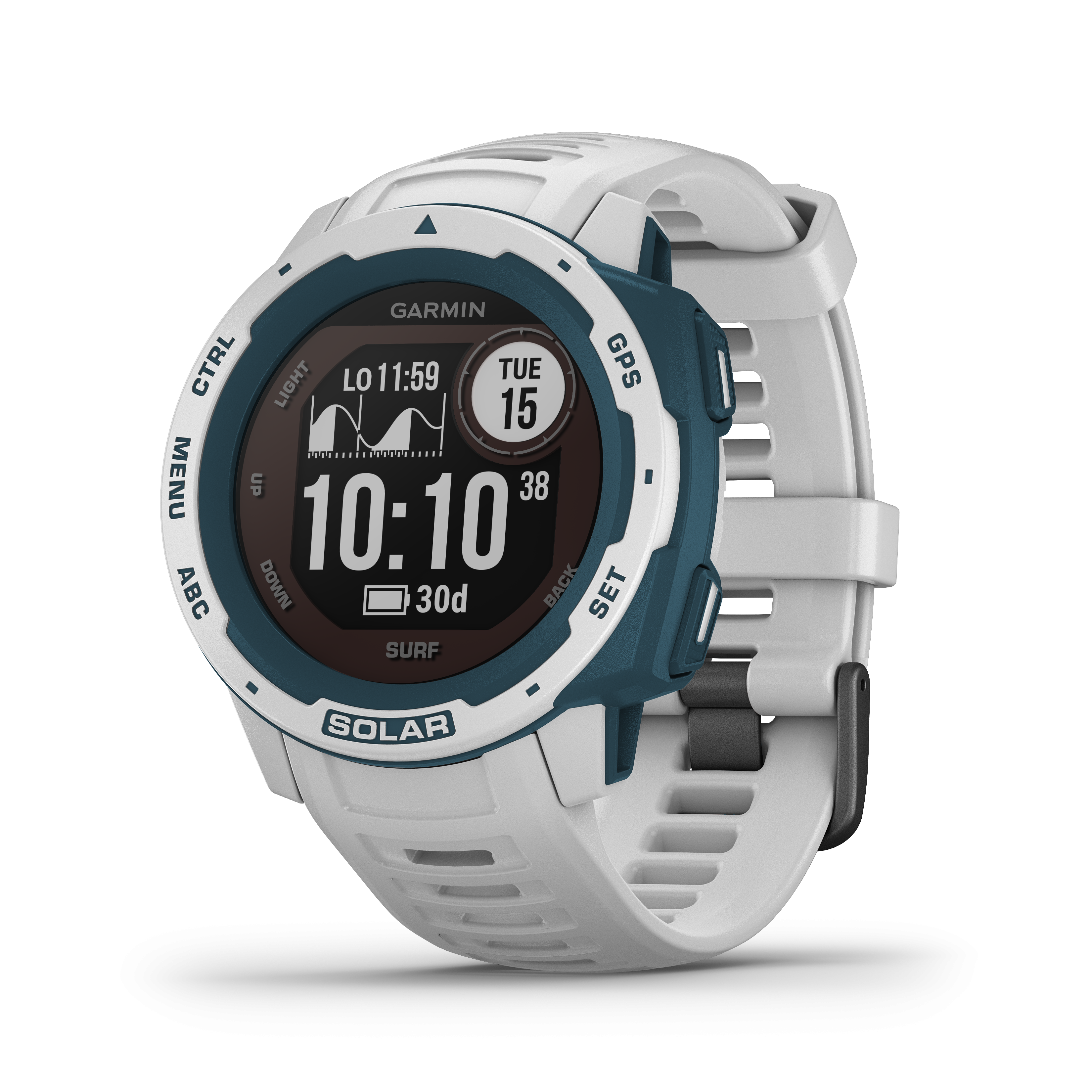 Med träningsklocka Garmin Instinct Solar Surf kör du tills tidvattnet vänder med dedikerade surffunktioner, fantastisk batteritid och solenergiladdning. Modellen är vattentålig upp till 100 meter och har en fiberförstärkt polymerboett, reptåligt Corning® Gorilla®-glas samt ett batteri som laddas av solen får du en enhet som är byggd för att vara länge. Dess starka färg, skärmar med hög kontrast och ändamålsenliga design väcker liv i en otraditionell smartwatch vilket utan tvekan får folk att vända på huvudet.
